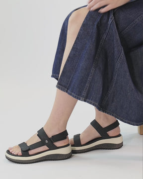 Wedge sandals. Black nappa grass leather. Velcro Closure. Leather lining. Anatomical insole. Flexible and durable Polyurethane sole. Heel height: 7.25 cm. 100% Made in Spain.