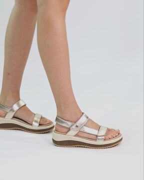 Wedge sandals. Gold nappa leather. Velcro Closure. Leather lining. Anatomical insole. Flexible and durable Polyurethane sole. Heel height: 7.25 cm. 100% Made in Spain.