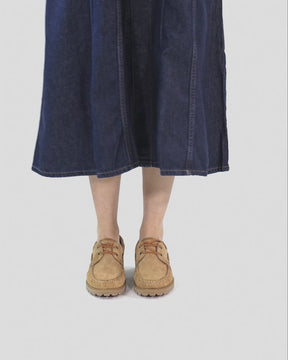 Lady Boat Shoe. Natural suede. Lace-up Closure. Leather lining. Removable anatomical insole. Natural, flexible and durable rubber sole. Heel height: 4 cm. 100% Made in Spain.