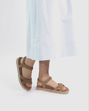 Flat woman's sandals. Natural suede. Velcro Closure. Leather lining. Anatomical insole. Flexible and durable Polyurethane sole. Heel height: 4.5 cm. 100% Made in Spain.