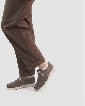 Women's shoes. Suede in pebble-grey. Lace-up Closure. Leather lining. Removable anatomical insole. Flexible and durable Polyurethane sole. Shaft height: 10,3 cm. Heel height: 4.7 cm. 100% Made in Spain.